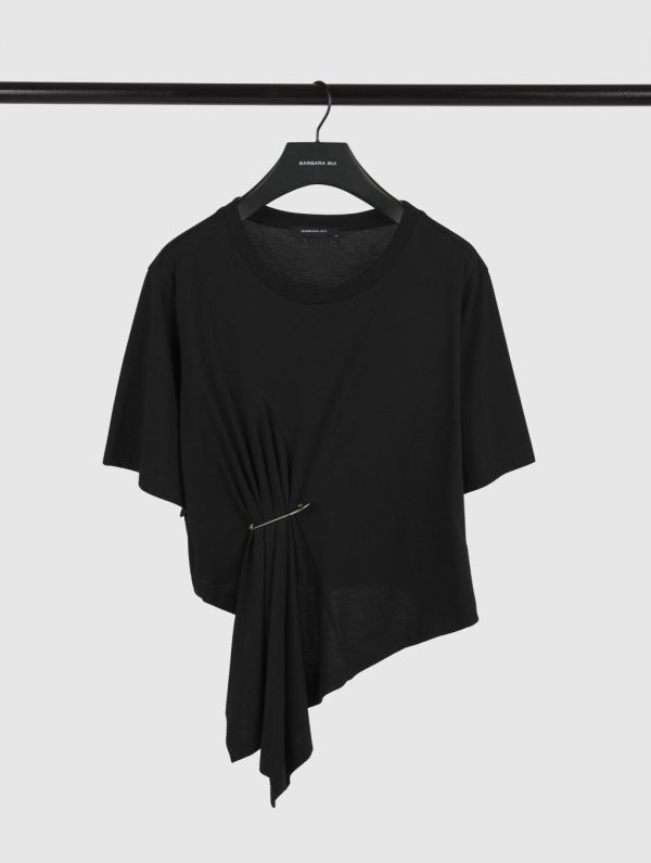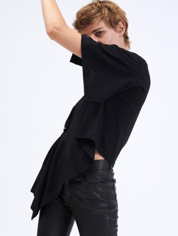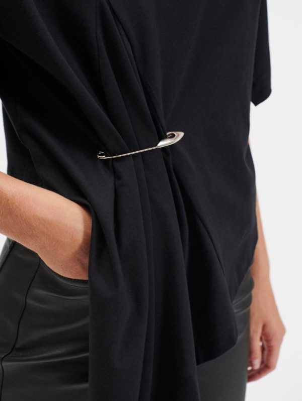 Barbara Bui’s rock heritage gives this women’s cotton T-shirt a unique look. Combining feminine elegance and punk details, this cotton jersey T-shirt available in black or white is embellished with a removable silvery metal safety-pin for an elegant draped look. The slit sleeves and asymmetrical front make this T-shirt ideal for mid-season wear. Wear this women’s T-shirt with leather trousers for an uncompromising rock attitude.Model measures 180cm tall, with 90cm hips, 63cm waist and 78cm bust / Model measures 5’11” tall, with 35,5″ in. hips, 24,5″ in. waist and 30,5″ in. bust.