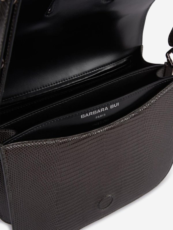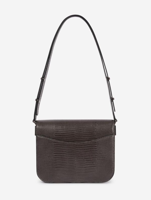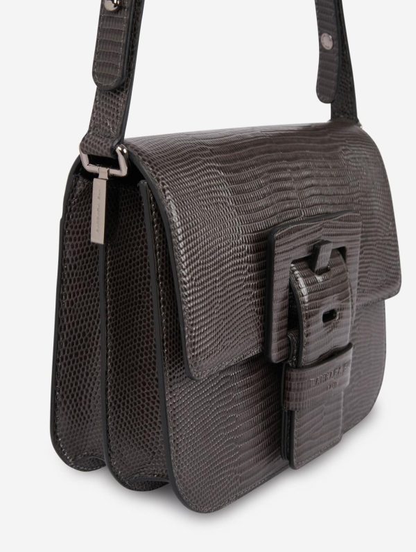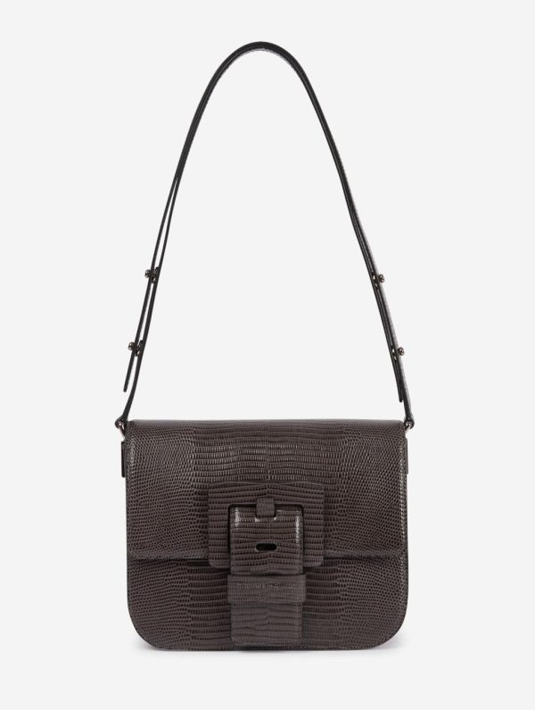 TOUCH ME bag in anthracite grey lizard skin embossed leather. Double shoulder strap, can be worn long for a more casual look. Decorative leather belt buckle on the magnetic closure flap. Back and front pockets, double inside compartment with pockets.