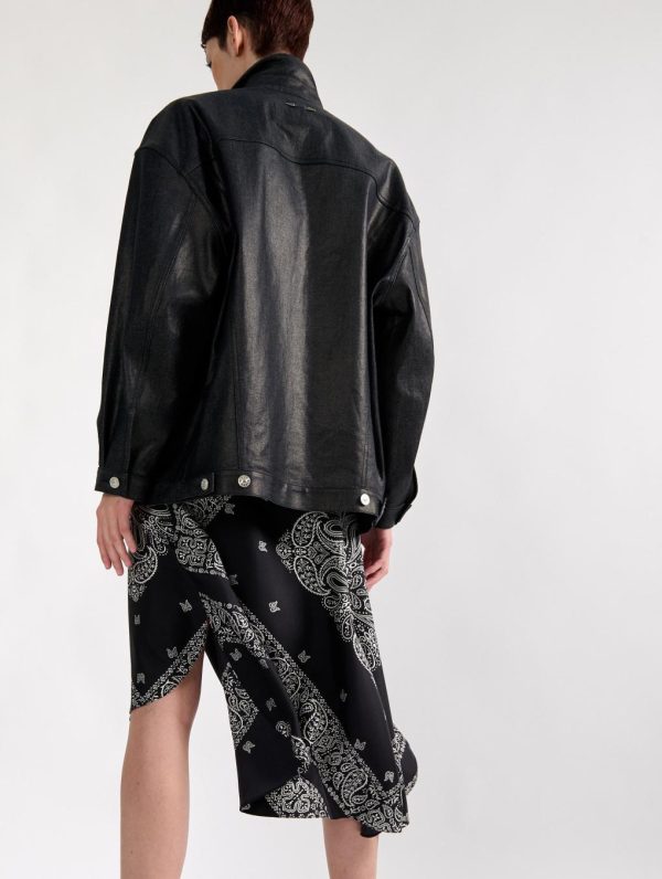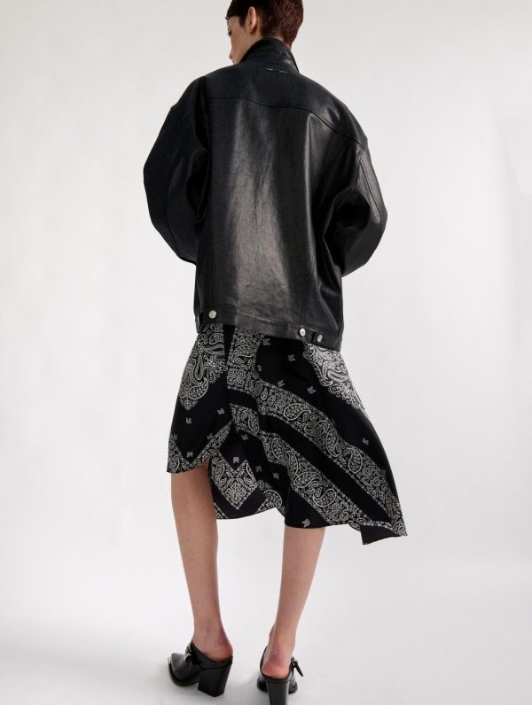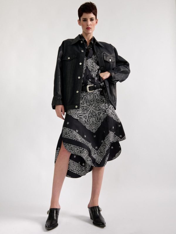 This flowing bandana-print skirt features a slightly asymmetrical cut and belt loops. Cut in fluid silk for added softness, this skirt pairs perfectly with the matching blouse for a shirt-dress effect. Paired with a pair of clog mules and a leather or waxed denim jacket, this skirt offers a modern, summery silhouette.