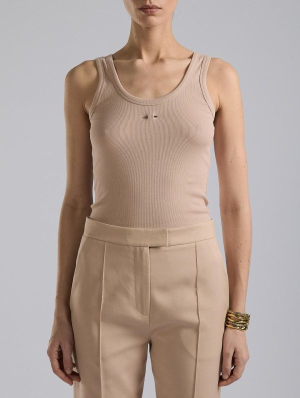 Elevate your year-round wardrobe with this essential ribbed cotton tank top from luxury designer Barbara Bui. The premium stretch cotton blend offers exceptional comfort and flexibility for all-day wear. Features a distinctive silver metal piercing jewel on the front and the sophisticated Barbara Bui logo elegantly displayed on the back. Perfect for versatile styling – layer it under blazers, shirts, or wear it standalone for a polished look.