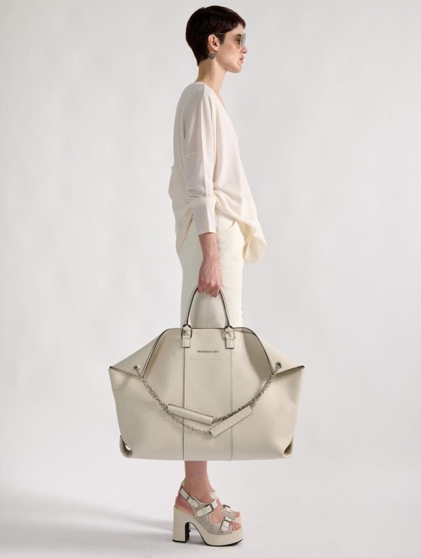 “BIG CHAMALLOW” large tote bag in ivory grained calfskin with reversible effect lining. Articulated hand-carried handles and sliding chain shoulder strap allowing either short double chain or long single chain shoulder carrying. Inside patch pocket and central magnetic closure. Height 41cm – Length: 64cm – Depth: 18cm.Height 41cm – Length: 64cm – Depth: 18cm.