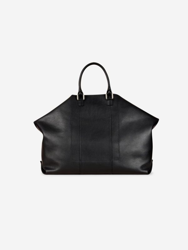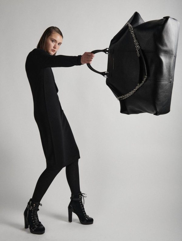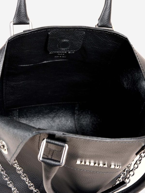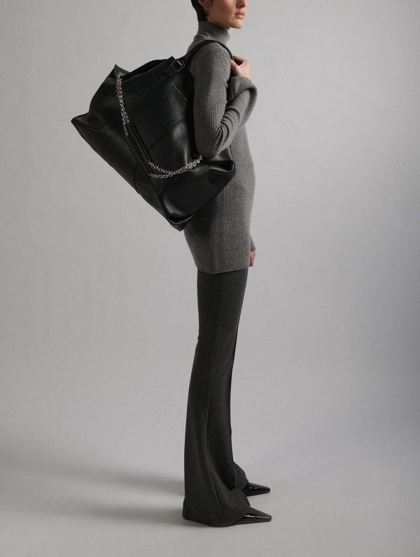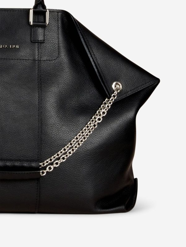 Big CHAMALLOW tote bag in black grained leather, double-sided effect bonded lining. Articulated carry handles. Sliding chain shoulder strap for either short double-chain or long single-chain shoulder carrying. Inside patch pocket and magnetic closure. Height: 40cm – Width: 64cm – Depth: 18cm.Height : 40cm – Length : 64cm – Depth : 18cm.100% Calfskin