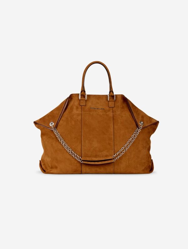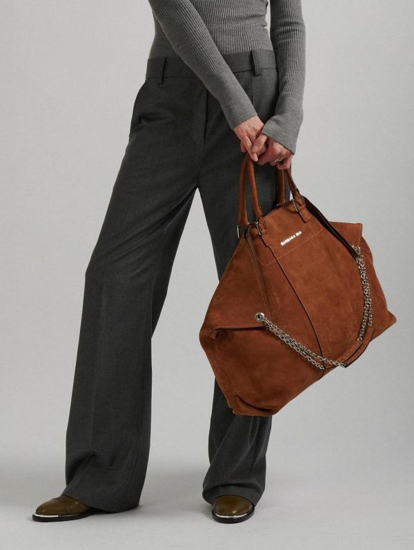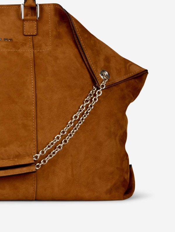 “Big CHAMALLOW” tote bag in chestnut nubuck leather, double-sided effect bonded lining. Articulated carry handles. Sliding chain shoulder strap for either short double-chain or long single-chain shoulder carrying. Inside patch pocket and magnetic closure. Height: 40cm – Width: 64cm – Depth: 18cm.Height : 40cm – Length : 64cm – Depth : 18cm.100% Calfskin