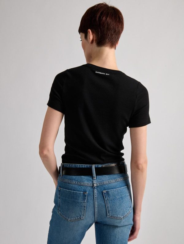 This soft, comfortable cotton tee features a draped neckline that creates a feminine opening on the rounded neckline. Resolutely contemporary yet easy to wear, this women’s tee comes in a luminous white or deep black to pair with leather trousers for a rock silhouette. On the back, the iconic Barbara Bui piercing jewel accompanies the logo of our Parisian fashion house.