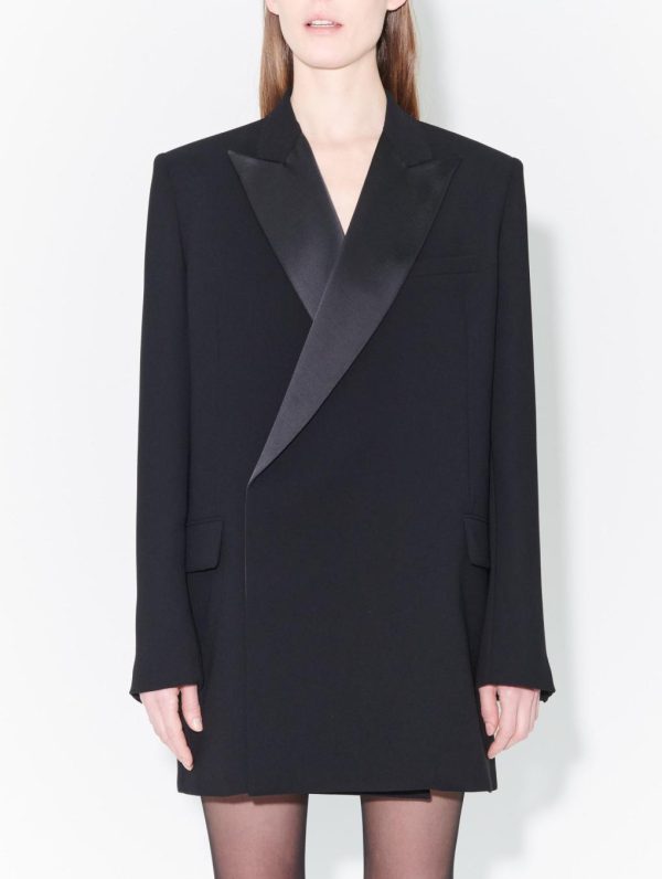 This stylish slightly oversize swing jacket is worn as a short coat for a sophisticated, feminine style. This women’s black crepe jacket with its minimalist, androgynous look is characterised by a wide satin lapel collar giving a contrast effect typical of Barbara Bui. This swing jacket is closed with a concealed button and button tab for a perfect style with flawless drape. Available in black or white, this coat jacket was created by our designer to be worn over a dress or a pair of shorts for an everyday couture style.Model measures 178cm tall, with 91cm hips, 60cm waist and 82cm bust / Model measures 5’9,5″ tall, with 35.8″ in. hips, 23,5″ in. waist and 32.2″ in. bust.