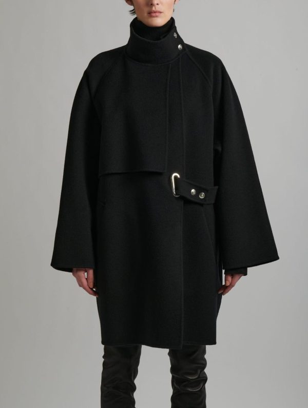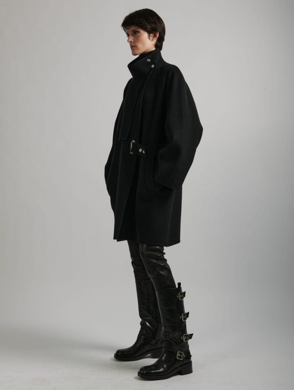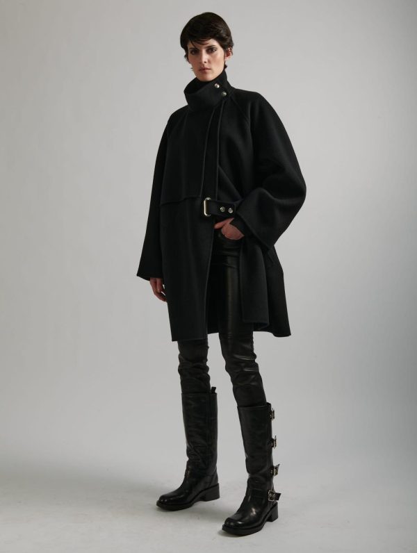 The Barbara bui’s signature art of tailoring is perfectly expressed in this women’s coat crafted with precision. Made from pure double-faced wool in black or sand, this unlined coat features multiple details for a dynamic look. Its high collar buttons with two press studs while its recall strap elegantly closes the coat. Its seam play, discreet storm flap, and raglan armholes, ideal for layering over a thick winter sweater, make it a timeless piece you’ll enjoy year after year.Model measures 178cm tall, with 89cm hips, 64cm waist and 86cm bust / Model measures 5’10” tall, with 35″ in. hips, 25″ in. waist and 34″ in. bust.