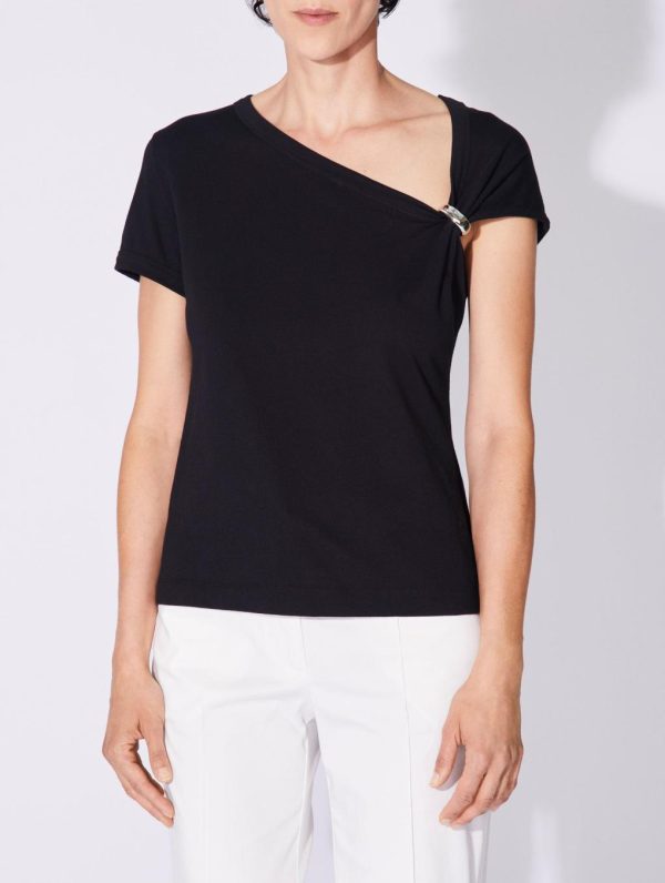 Experience the perfect blend of comfort and sophistication with this premium cotton jersey women’s T-shirt from Barbara Bui. The design features a classic shoulder line complemented by an artfully draped silhouette that creates a stunning asymmetric neckline, elegantly secured with a removable silver metal ring accent. Available in versatile black and white, this beautifully detailed top will quickly become your go-to essential for effortless style.Model measures 178cm tall, with 89cm hips, 64cm waist and 86cm bust / Model measures 5’10” tall, with 35″ in. hips, 25″ in. waist and 34″ in. bust.