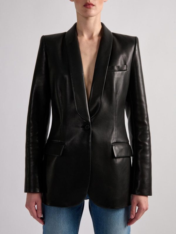 Experience the perfect fusion of rock-inspired edge and sophisticated elegance with Barbara Bui’s signature leather craftsmanship. This premium black plongé lambskin jacket features a sleek slim-fit design that contours your silhouette with precision tailoring and strategically placed seams. The minimalist shawl collar adds a touch of refined luxury, making this versatile piece perfect for both professional settings when paired with tailored trousers or casual everyday wear with jeans and your favorite shirt.