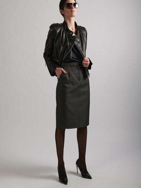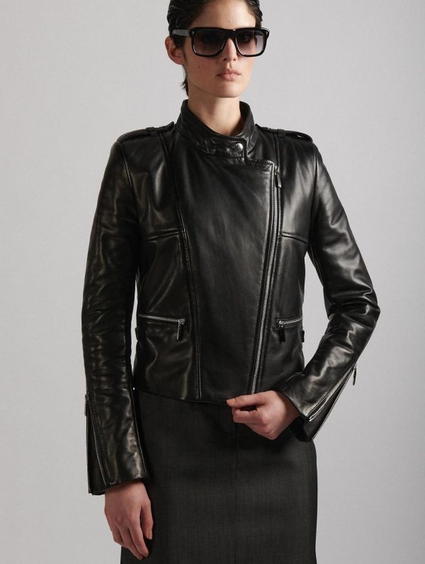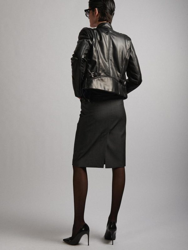 This season marks the comeback of leather jackets in our collections. Barbara Bui revisits her iconic black lambskin leather jacket. Shoulder tabs and a small biker collar fastened with a branded snap fastener give structure to the silhouette, while buckled tabs on the sides ensure a perfect fit. Zipper closure and zipper details on side pockets and cuffs. On the back, the removable metal piercing, a signature of the House.Model measures 178cm tall, with 89cm hips, 64cm waist and 86cm bust / Model measures 5’10” tall, with 35″ in. hips, 25″ in. waist and 34″ in. bust.