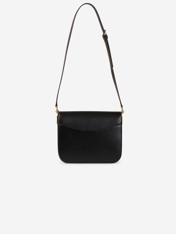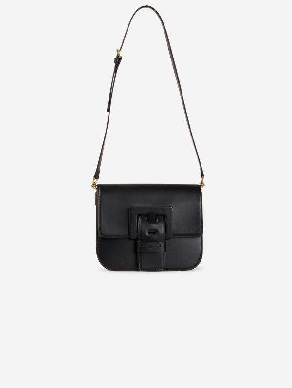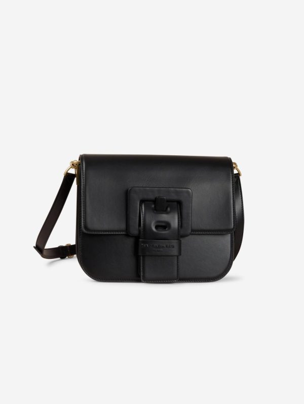TOUCH ME bag in smooth black leather. Magnetic fastening flap and the signature large leather buckle from our “ME” line of bags. Adjustable shoulder strap with buckle for crossover or hand-carrying. Front and back pocket, double inside compartment with pockets. Height: 19 cm / Length: 22.5 cm / Depth: 7.5 cm.Height : 19 cm – Longueur : 22,5 cm – Depth : 7,5 cm.100% Calf leather