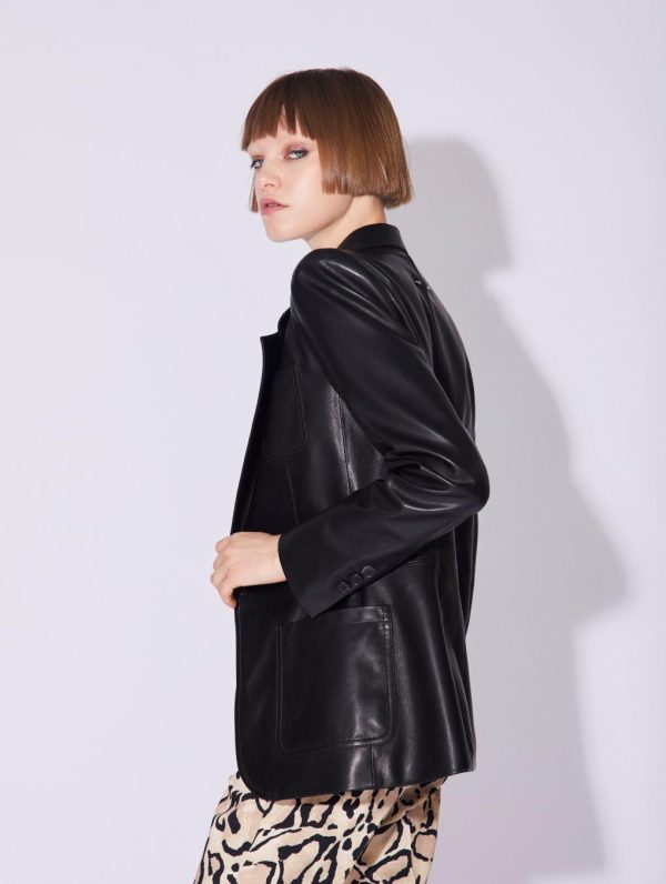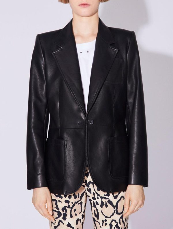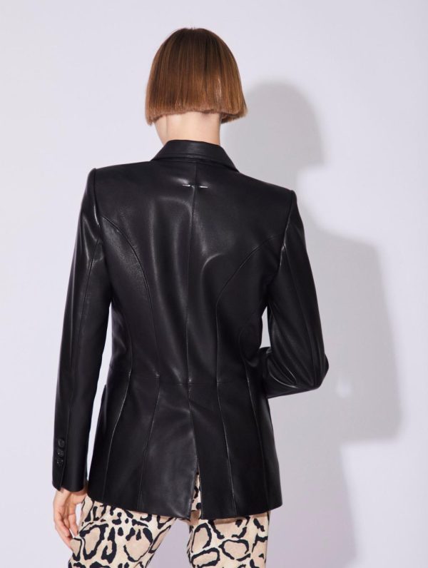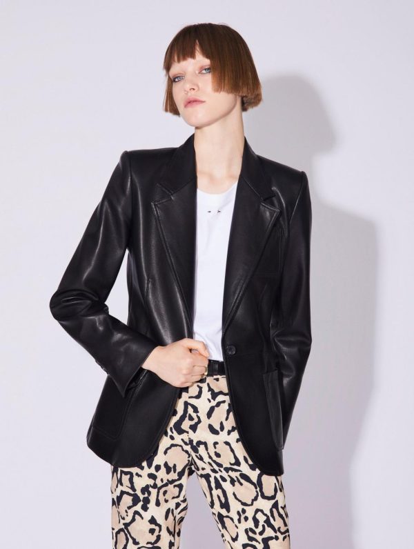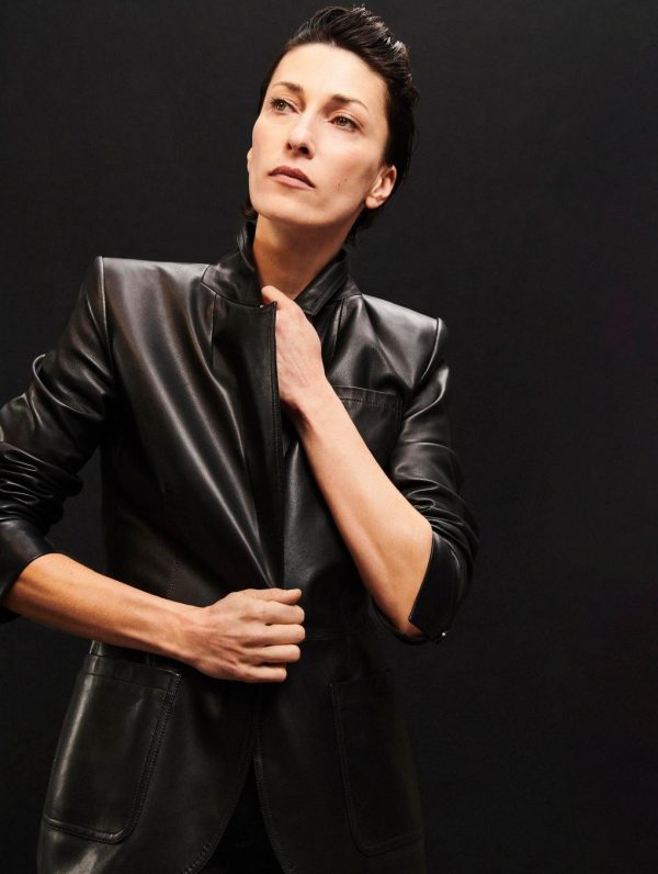 This slightly fitted women’s blazer is made in luxurious plongé lambskin and comes in camel or timeless black. Featuring two patch pockets and a chest pocket, this single-breasted blazer ensures a structured silhouette especially when paired with its sleeveless suit waistcoat. At the back, the seam detailing and rear vent bring flawless drape and added comfort, showcasing our house’s expertise. With its button placket at the cuffs and our silver metal piercing detail, this women’s jacket promises an impeccable look. Lined in our “Portobello” print, this plongé lambskin blazer lives up to its 70’s inspiration.Model measures 175cm tall, with 86cm hips, 59cm waist and 79cm bust / Model measures 5’9″ tall, with 34″ in. hips, 23″ in. waist and 31″ in. bust.