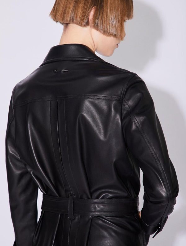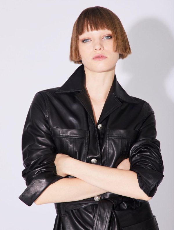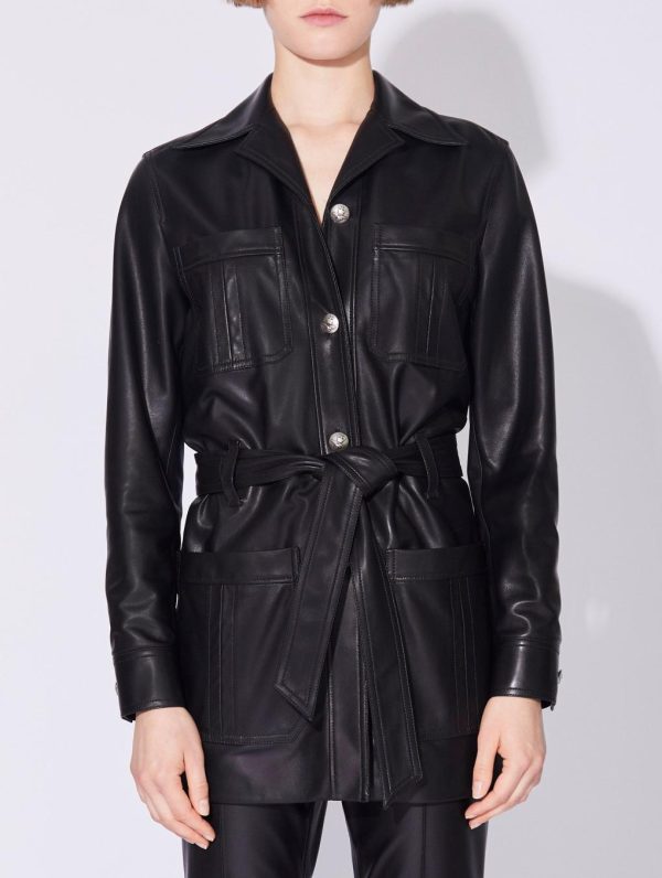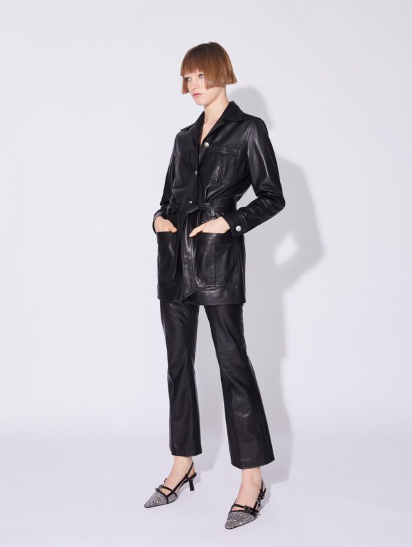 This plongé lambskin safari jacket will be the centrepiece of your looks. In camel or black, this women’s jacket reflects the alluring power of the Barbara Bui woman by revisiting the iconic pieces of the Parisian wardrobe. For a flawless drape this safari jacket features a sewn rear vent, a belt and loops as well as four patch pockets at the front. The cuffs and button placket are highlighted with military-look metal buttons while the silver metal piercing at the back gives this plongé lambskin safari jacket a signature rock twist.Model measures 175cm tall, with 86cm hips, 59cm waist and 79cm bust / Model measures 5’9″ tall, with 34″ in. hips, 23″ in. waist and 31″ in. bust.