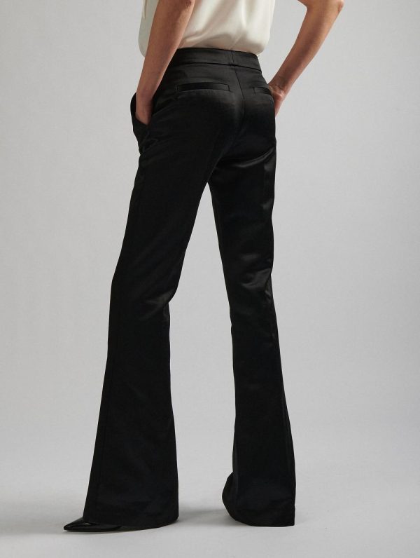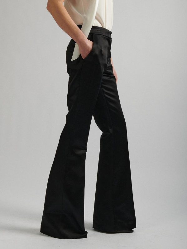 Elevate your evening wardrobe with these sophisticated smoking trousers that masterfully blend masculine tailoring with feminine elegance. Expertly crafted in the Maison’s ateliers, these pants create a sculpted silhouette with clean, defined lines that flatter your figure. Made from luxurious tuxedo satin, these black trousers feature a flattering bootleg cut that gracefully flares at the hem for a sleek, elongated appearance. The design includes elegant Italian pockets, discreet welt back pockets, and a hidden button placket that maintains its minimalist sophistication. Perfect for special occasions, pair these stunning trousers with our black velvet tuxedo jacket for a complete evening look.Model measures 178cm tall, with 89cm hips, 64cm waist and 86cm bust / Model measures 5’10” tall, with 35″ in. hips, 25″ in. waist and 34″ in. bust.