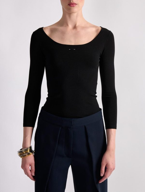 Made in a second-skin knit for a soft, stylish wear, this ballerina neckline sweater is available in black or khaki, the ideal color for the start of the season. Accessorized with our emblematic piercing jewel, this refined, timeless fine sweater will match all your fashion desires this season.