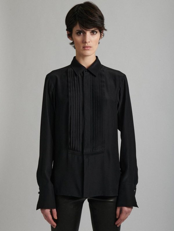 Crafted in black silk crepe, this shirt is inspired by the men’s version with its musketeer cuffs, adorned with elegant cufflinks like black pearls. On the back, a set of darts offers a smart fall, while on the front, this silk shirt with hidden button placket reveals the worked pleats of its impeccable bib. Worn with suit pants or slipped into leather pants, it will remain a timeless wardrobe staple.Model measures 178cm tall, with 89cm hips, 64cm waist and 86cm bust / Model measures 5’10” tall, with 35″ in. hips, 25″ in. waist and 34″ in. bust.