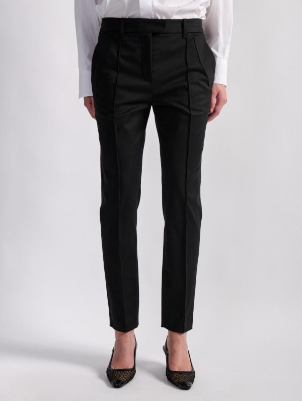 With their straight cigarette cut and 7/8 length, these Roxy pants in stretch cotton canvas will accompany you all season long. Available in a luminous sand color or timeless black, these sharply pleated pants ensure a sleek silhouette, worn flat or with a pair of small-heeled, open-toe pumps. A discreet and original detail, a flap dresses up the pocket entries for an elegant trompe l’oeil. Wear this model with the matching 3-pocket suit jacket for a polished look in all circumstances.