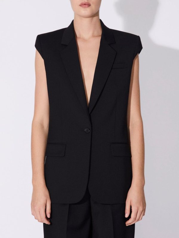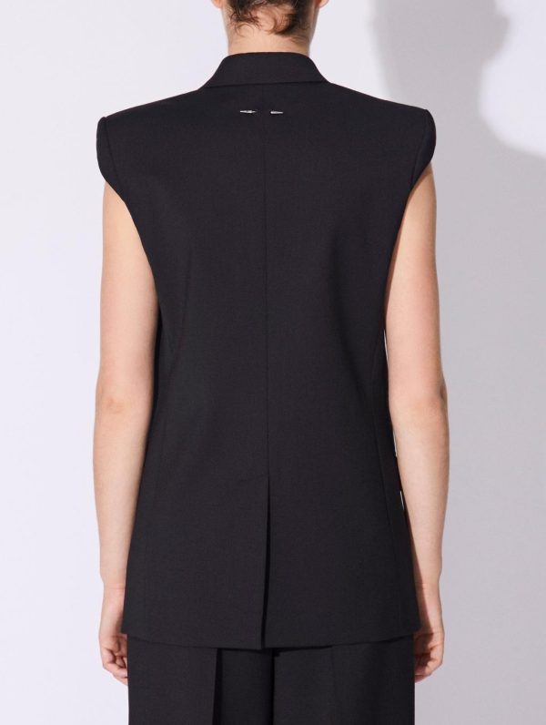 This sleeveless jacket from the Barbara Bui Costumes suit range gives the silhouette a classy, feminine look. The padded shoulders provide drape while the button allows it to be worn slightly fitted. The vent at the back ensures ease of movement and the detachable piercing detail brings the signature Barbara Bui rock touch. Worn next to the skin or over a toning suit waistcoat, this women’s sleeveless jacket in stretch wool gabardine is a cornerstone of our tailoring collection.Model measures 180cm tall, with 90cm hips, 63cm waist and 78cm bust / Model measures 5’11” tall, with 35½” in. hips, 24,8″ in. waist and 32″ in. bust.