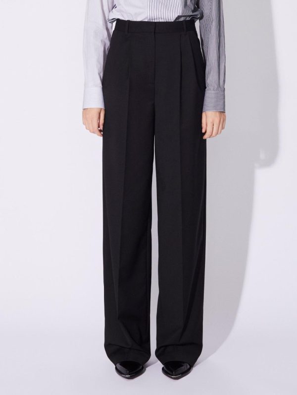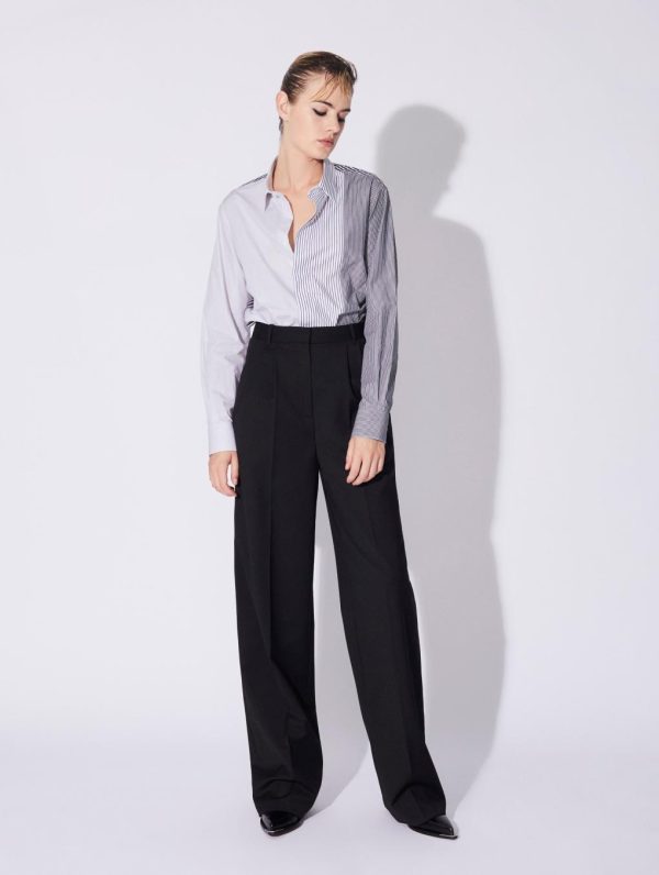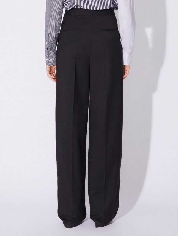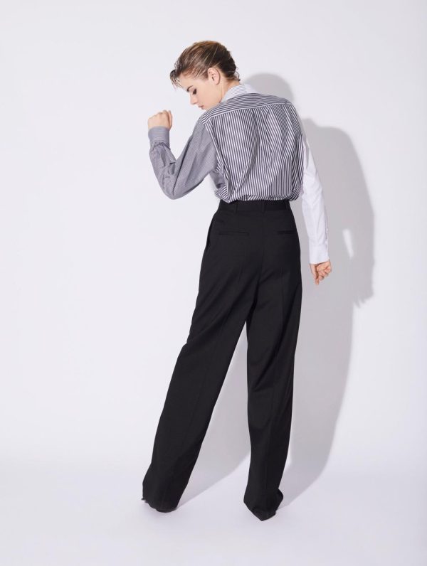 For Barbara Bui, trousers define the look and dictate body language. This is certainly true of this wide-leg model with its androgynous style. Made in comfortable stretch wool gabardine these women’s suit trousers feature pleated legs and a flattering high waist. With its concealed button placket, slant pockets and rear welt pockets, these wide trousers team well with a poplin shirt or a suit waistcoat. This timeless model from the Barbara Bui Suits line can be worn with a belt.Model measures 180cm tall, with 90cm hips, 63cm waist and 78cm bust / Model measures 5’11” tall, with 35½” in. hips, 24,8″ in. waist and 32″ in. bust.
