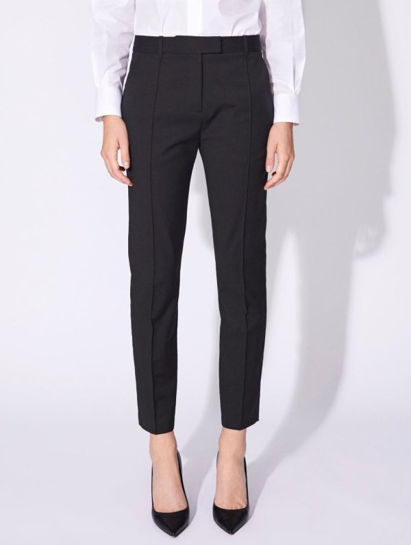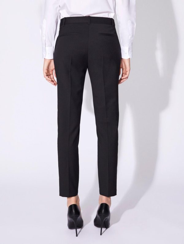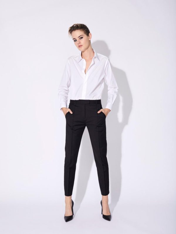 Ideal to wear at the office or as part of a smart outfit, the Roxy women’s suit trousers make their entrance in the Barbara Bui suits line. In black stretch wool gabardine, these comfortable trousers with their figure-flattering pleats on the legs will team well with a casual T-shirt or a cotton poplin shirt. They can be worn separately or as part of a three piece suit with the matching suit waistcoat and jacket. The concealed button placket, slant pockets and rear welt pockets reflect our tailoring expertise.Model measures 180cm tall, with 90cm hips, 63cm waist and 78cm bust / Model measures 5’11” tall, with 35½” in. hips, 24,8″ in. waist and 32″ in. bust.