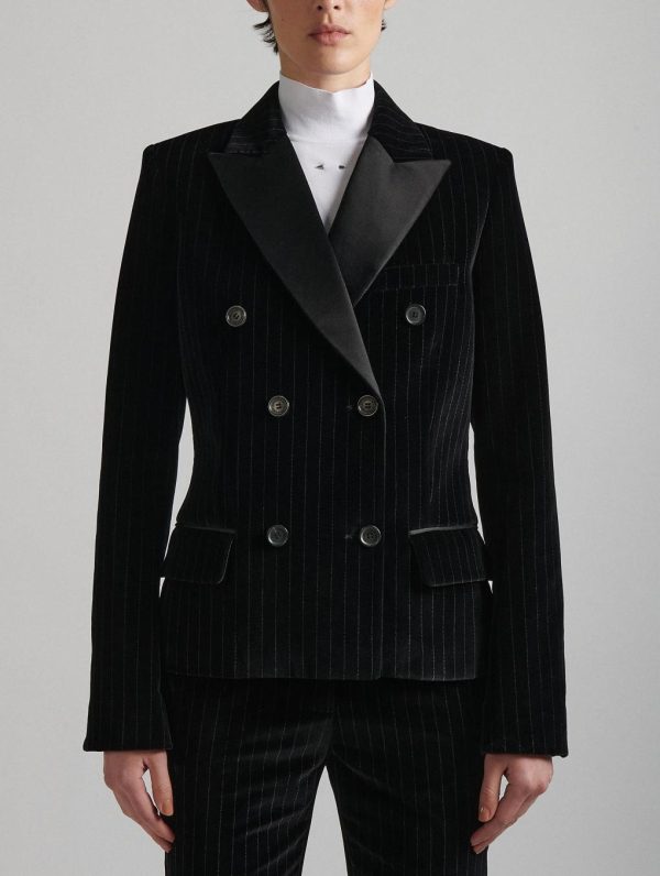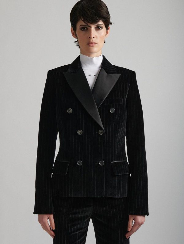 For a sophisticated rock look, this tuxedo jacket is crafted in black velvet with fine stripes. Its structure is highlighted by a black satin point collar and double buttoning. Featuring a breast pocket and two piped flap pockets, this striped velvet jacket has all the finishing touches of the finest tailoring. On the back, the removable silver-plated piercing jewel, a Maison signature. Worn with matching striped velvet pants, this jacket promises a remarkably elegant outfit.Model measures 178cm tall, with 89cm hips, 64cm waist and 86cm bust / Model measures 5’10” tall, with 35″ in. hips, 25″ in. waist and 34″ in. bust.