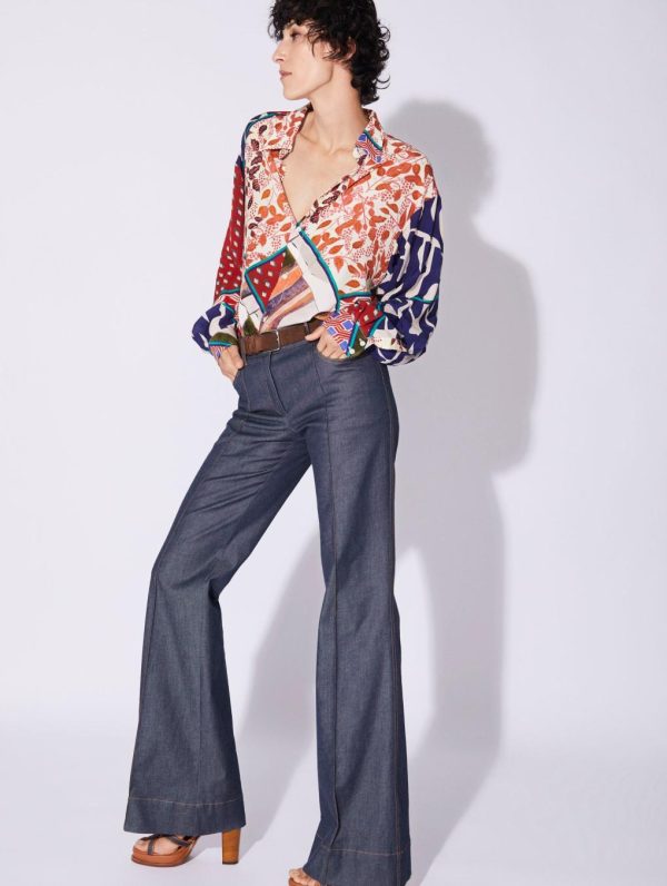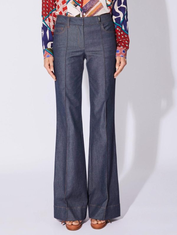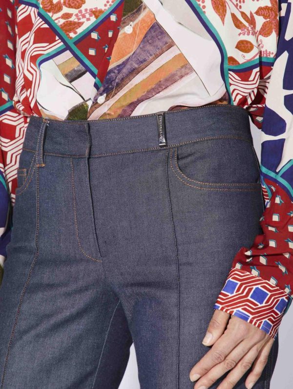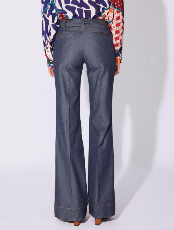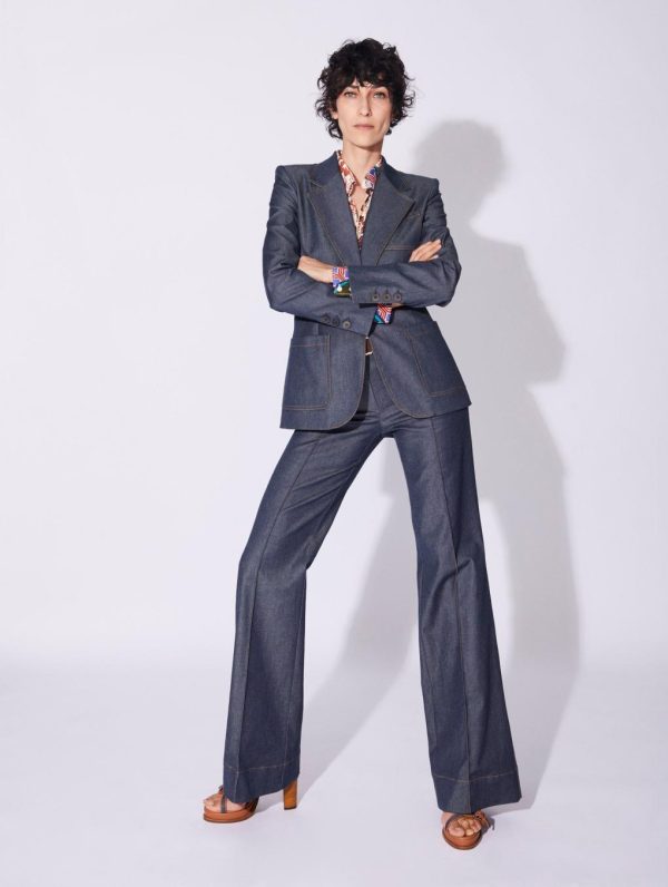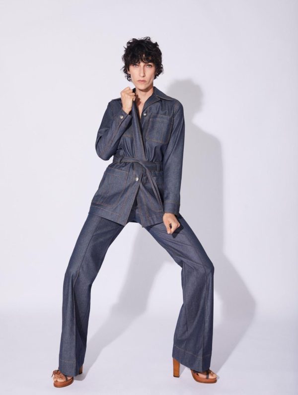 Drawing on the Seventies for her inspiration our designer created these flared trousers to give a sharp feminine outline. The washed denim fabric, available in blue, cream or linden green, will match all your fashion choices this season, whether you wear these women’s trousers with a printed shirt, a fine-knit sweater or our gold lamé camisole for an evening occasion. Sewn pleats, welt pockets and belt loops, including a branded jewel loop in silver metal, prove that even our most casual pieces merit the same close attention to the cut and the finishing details.Model measures 178cm tall, with 89cm hips, 64cm waist and 86cm bust / Model measures 5’10” tall, with 35″ in. hips, 25″ in. waist and 34″ in. bust.