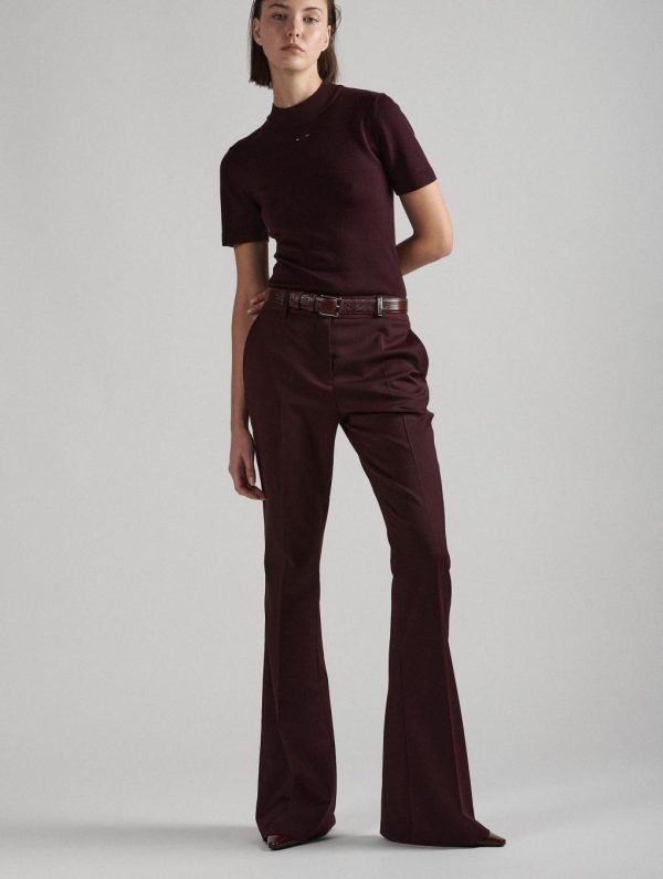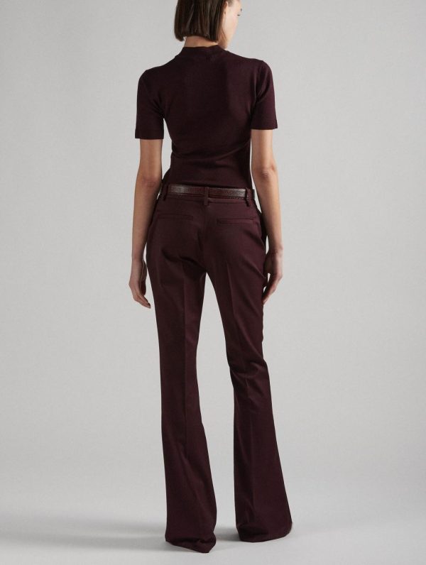 Flattering and stylish, these bootleg-cut trousers with welt back pockets enhance the silhouette. A pleat along the leg promises a slim look, whether worn with a pair of heels or flat derbie’s. Its belt loops, including a silver-plated jeweled loop embossed with the Maison’s name, allow you to slip on a tone-on-tone embossed leather belt. Crafted in comfortable burgundy or black stretch wool gabardine, these pants are ideal for a monochrome look paired with our collection of fine merino knit sweaters.Model measures 177cm tall, with 88cm hips, 59cm waist and 75cm bust / Model measures 5’9,5″ tall, with 34″ 1/2 in. hips, 23″ in. waist and 29″ 1/2 in. bust.