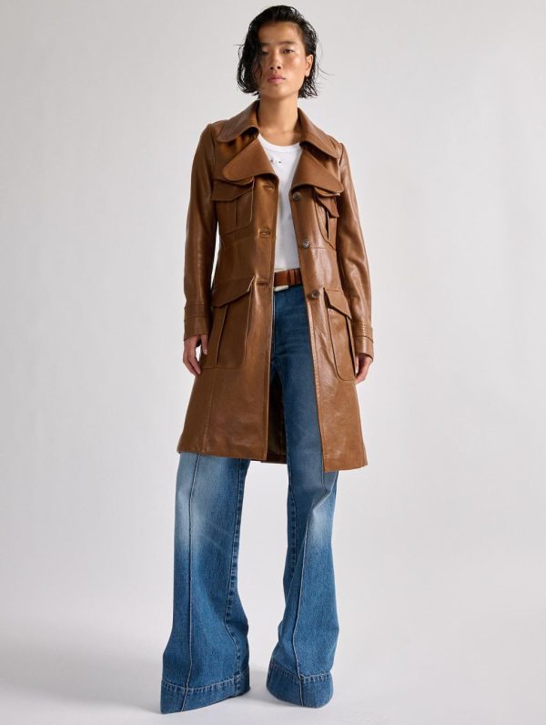 Made from premium plongé lambskin with meticulous topstitching, this coat rekindles the effortless cool of the 1970s. A statement piece with a bold character, it draws inspiration from the trench coat and safari jacket, while its tailored silhouette highlights its refined elegance. Paired with this season’s flared trousers, this mid-length coat—available in navy blue or camel leather—makes a striking entrance in the Barbara Bui wardrobe.
