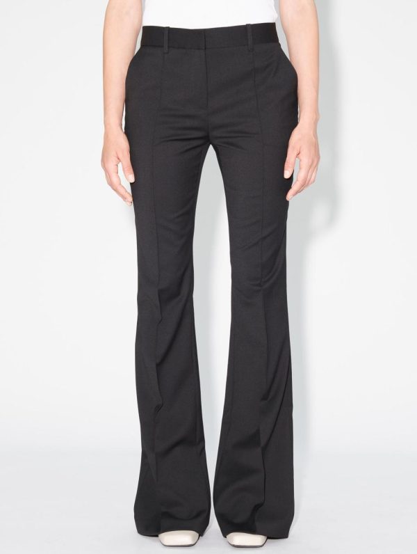 Choose these elegant bootleg cut trousers for a streamlined silhouette. Crafted in comfortable stretch wool gabardine for a perfect fit, these women’s suit trousers will become a wardrobe essential. The slant pockets enable you to slide your hands inside to strike a casual pose while the rear welt pockets and stitching along the length of the leg are figure-flattering. Featuring loops at the waist, these tailored trousers can be accessorised with a slim belt. Wear these black trousers as part of a total tailored look or team them with a cotton tank top for an artfully casual style.Model measures 177cm tall, with 91cm hips, 63cm waist and 86cm bust / Model measures 5’8″ tall, with 36″ in. hips, 24,8″ in. waist and 33,8″ in. bust.