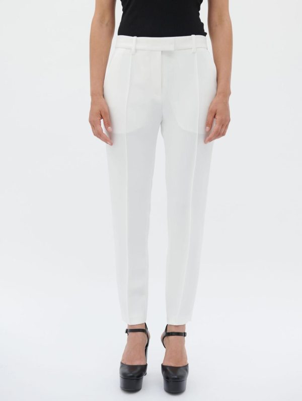 These timeless women’s suit trousers embody Barbara Bui’s mastery of tailoring codes and reflect the best features of masculine tailoring. The pleat along the leg and elegant short 7/8 length streamline the silhouette and teaming the trousers with a pair of platform sandals will heighten this effect. Featuring slant pockets, discreet rear welt pockets and a concealed button tab, these flowy lightweight crepe trousers are ideal for a formal occasion or ceremony.Model measures 177cm tall, with 91cm hips, 63cm waist and 86cm bust / Model measures 5’8″ tall, with 36″ in. hips, 24,8″ in. waist and 33,8″ in. bust.