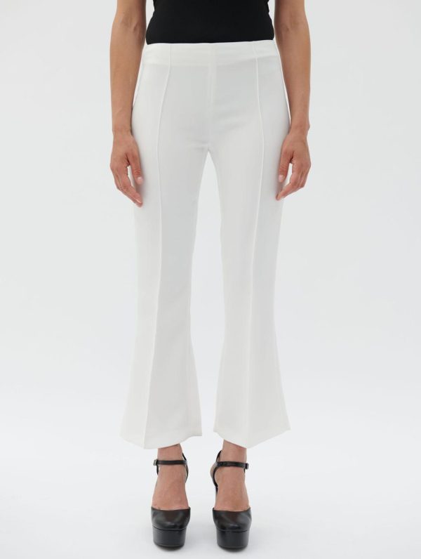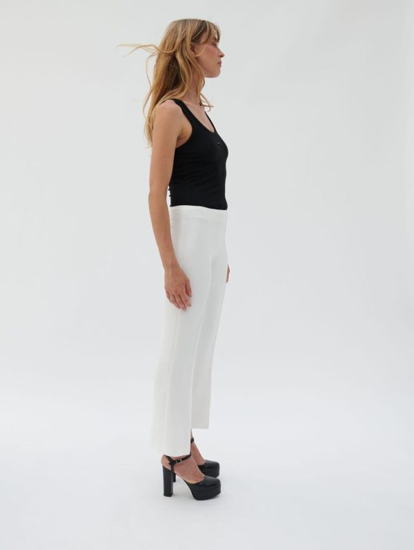 For the spring-sumer season our Roxy suit trousers come in a 7/8 length flared bootcut to reveal a glimpse of the ankle. These tailored women’s trousers flatter the legs thanks to their cropped length and sewn pleat along the front of the leg and can be worn with a pair of platform sandals to accentuate this effect. These minimalist women’s trousers in white, black or faded blue can be worn simply teamed with a cotton tank top for a casual look or with the matching suit jacket for a formal occasion, wedding or civil ceremony.Model measures 177cm tall, with 91cm hips, 63cm waist and 86cm bust / Model measures 5’8″ tall, with 36″ in. hips, 24,8″ in. waist and 33,8″ in. bust.
