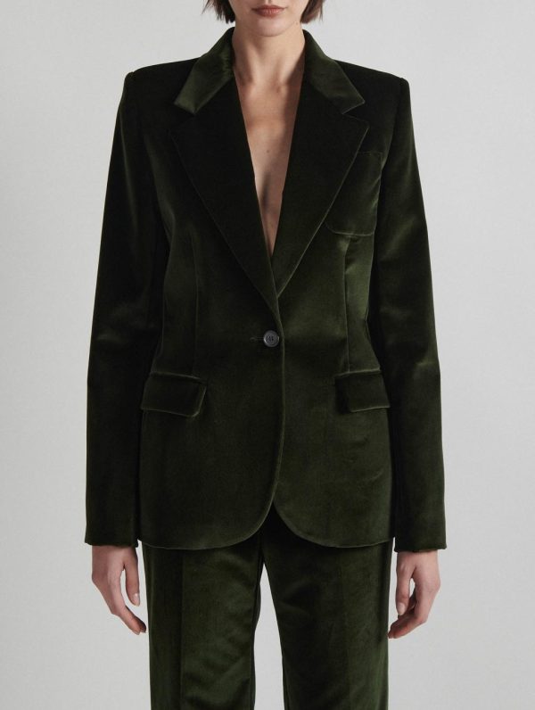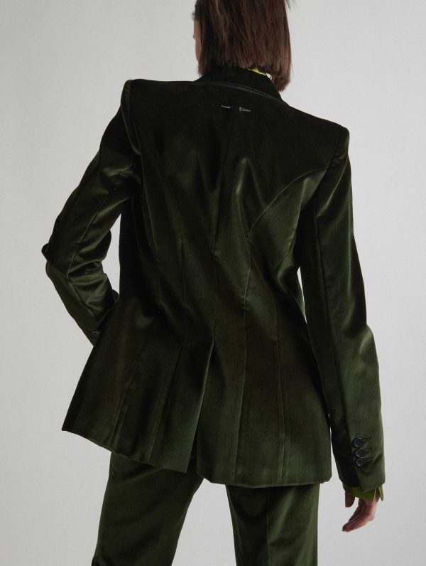 A great favorite in the Barbara Bui wardrobe, the velvet suit is reinterpreted this season in forest green, pomegranate or blue. Barbara Bui has created a sophisticated ensemble of bootleg pants and this smooth, slim-fit velvet jacket to take you from day to night. This one-button suit jacket features a minimalist tone-on-tone lining highlighted by saffron-colored piping. Its wide tuxedo collar, piped pockets and square chest pocket give structure to the silhouette. As for the luxurious velvet, it plays with light to present surprising reflections and unsuspected contrast effects. On the back, cleverly placed seams and the house’s signature removable piercing catch the eye.Model measures 177cm tall, with 88cm hips, 59cm waist and 75cm bust / Model measures 5’9,5″ tall, with 34″ 1/2 in. hips, 23″ in. waist and 29″ 1/2 in. bust.