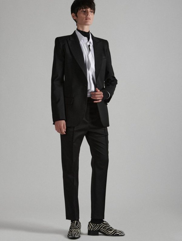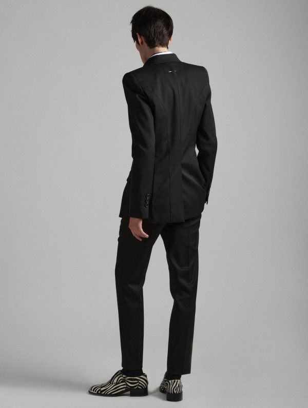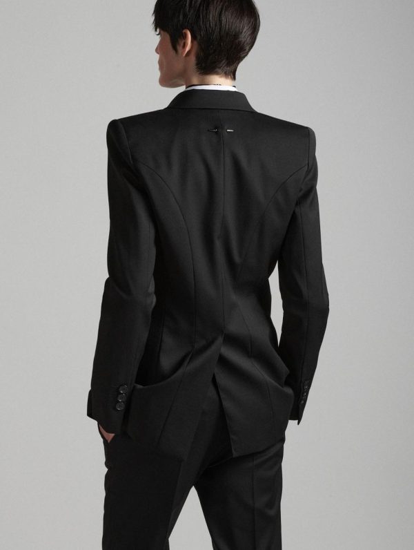 Carefully crafted in soft stretch wool gabardine, our button-fastening women’s suit jacket boasts an elegant slim fit. The notched collar and seam detailing underline the feminine structure of this jacket, which is embellished on the back with our iconic removable piercing jewel in silver metal. Worn as a three-piece suit with the sleeveless vest and matching pants, or mismatched with jeans, this jacket promises a sculptural look. A subtle detail: the BARBARA BUI COSTUMES fuchsia label signs this jacket, offered in blue or black wool gabardine.Model measures 178cm tall, with 89cm hips, 64cm waist and 86cm bust / Model measures 5’10” tall, with 35″ in. hips, 25″ in. waist and 34″ in. bust.