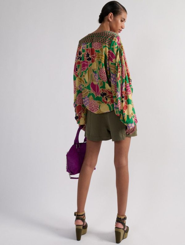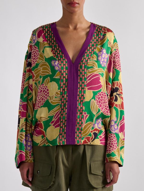 A Japanese-inspired mix-and-match of prints lends renewed sensuality to this silky-feeling flowing top. The bougainvillea neckline is highlighted by the use of cut and sew to unite and position the delicate printed inserts. Wide, kimono-inspired sleeves breathe volume and movement into the silhouette.