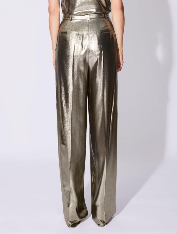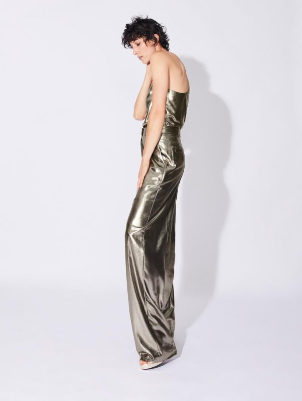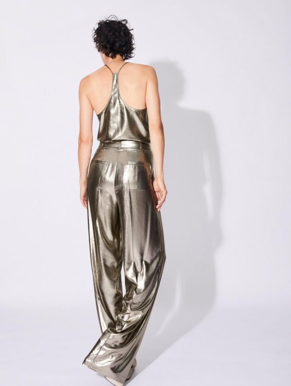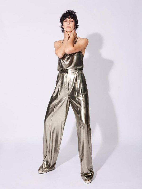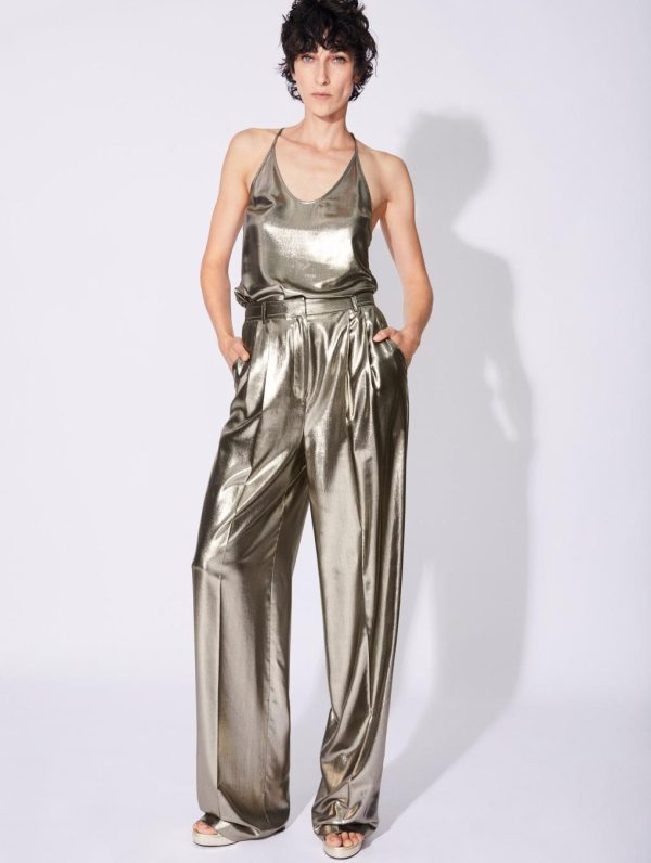 These flowy satin-lined gold lamé trousers are perfect for evening wear and summer ceremonies. The wide pleated legs give a streamlined look while the concealed button placket and the clever use of light and volume make these trousers the centre of attention. They can be worn with a belt or resting on the hips. Slant pockets and rear welt pockets ensure a flattering fit for these lamé trousers to pair with the matching gold-tone camisole top.Model measures 178cm tall, with 89cm hips, 64cm waist and 86cm bust / Model measures 5’10” tall, with 35″ in. hips, 25″ in. waist and 34″ in. bust.