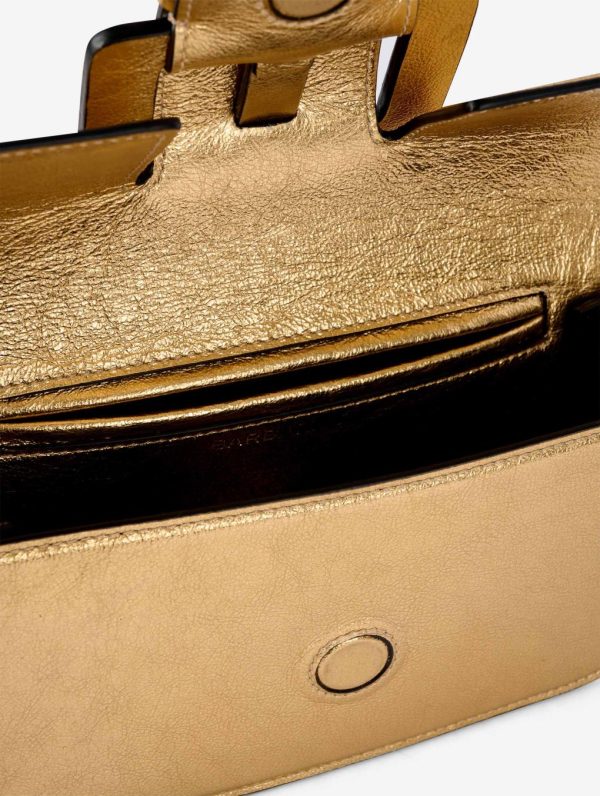 “LIKE ME” bag in stunning gold metallic milled calfskin leather. The versatile 100 cm gourmette chain shoulder strap and leather strap are fully removable to customize your carrying style. Features a striking maxi decorative buckle in reinforced leather on the flap with secure magnetic clasp. Convenient back pocket keeps your smartphone easily accessible plus a sleek piped inside pocket. Height: 12,5cm – Length: 21cm – Width: 4,5cm.Height: 12,5cm – Length: 21cm – Width: 4,5cm.