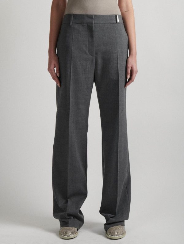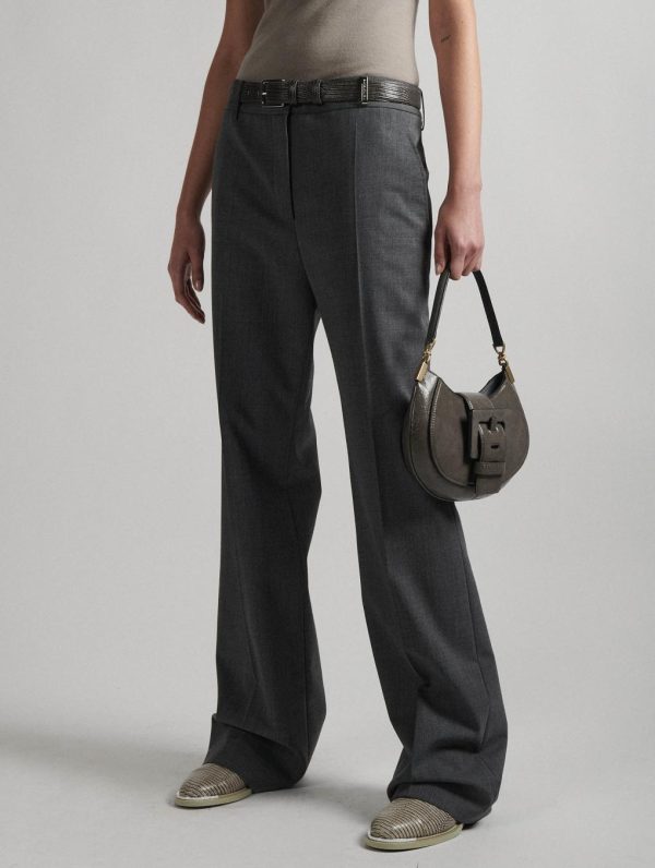 Barbara Bui has created a collection of pants with sharp lines. Made from comfortable stretch wool gabardine, these pants come in a range of timeless colors: grey, black and burgundy. Its straight, wide-leg cut, marked crease along the leg and low waist give it a modern, flattering look. Featuring Italian pockets, these pants have welt back pockets for a minimalist style inherited from our tailoring expertise. The embossed silver metal jewel loop is elegantly accented by an embossed leather belt.Model measures 177cm tall, with 88cm hips, 59cm waist and 75cm bust / Model measures 5’9,5″ tall, with 34″ 1/2 in. hips, 23″ in. waist and 29″ 1/2 in. bust.