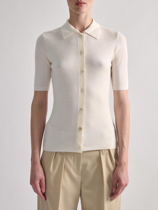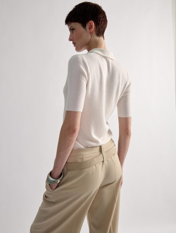 A blend of cardigan and polo, this fine knit women’s sweater in wool and silk is the perfect ally for mid-season wear. Its polo collar and elegant button placket allow you to adjust the fit for a classic silhouette or a more relaxed look. Featuring short sleeves, this buttoned sweater pairs beautifully with our wide-leg trousers, styled with double belts for a modern and trendy everyday outfit.