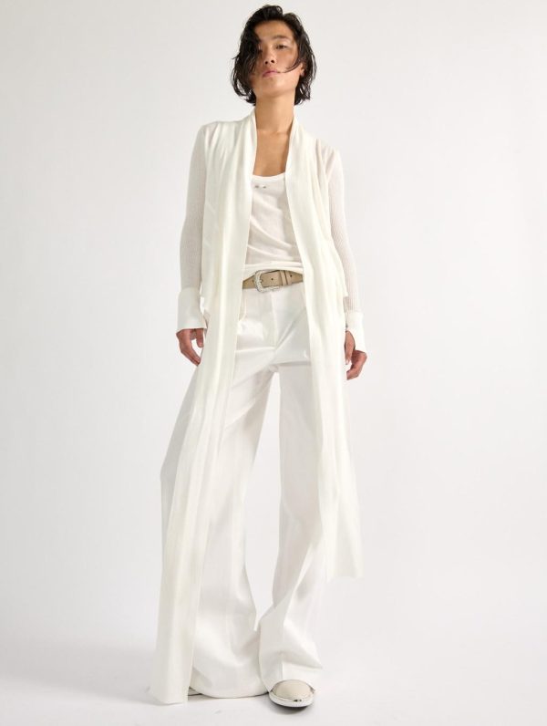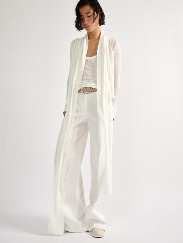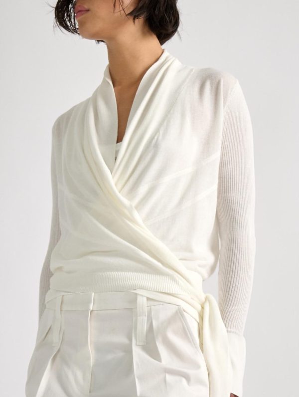 Inspired by dancer-style wraps with a crossover neckline, this model offers a rock and contemporary version with an emphasis on length. Its intentionally elongated integrated belt allows the jumper to be worn fitted to the body, with the belt cleverly tied or left deliberately loose at the side. Worn fully open, like a cardigan over the matching vest, this piece, available in three colours, embodies the cool, modern attitude that is characteristic of the spirit of our collections.