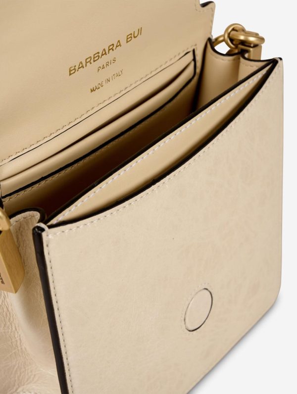 “LOVE ME” bag in elegant ivory naplak patent leather. Features a versatile 120 cm long narrow shoulder strap perfect for crossbody wear. Showcases a striking large decorative reinforced leather buckle on the magnetic closure flap for added sophistication. Practical front pocket, convenient back pocket to keep your smartphone easily accessible, and inside welt pocket for secure storage. Height: 16cm/ Length: 16cm/ Depth: 6.5 cm.Height : 16 cm – Longueur : 16 cm – Depth 6,5 cm.100% Calf leather