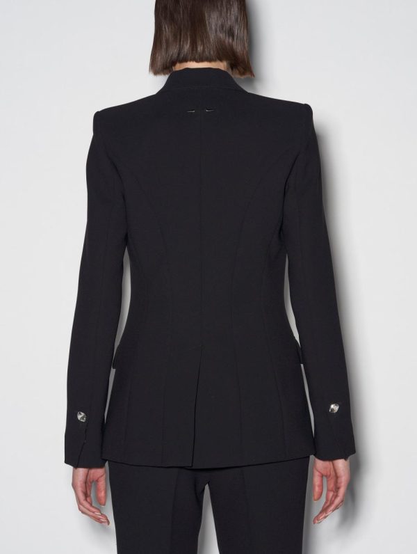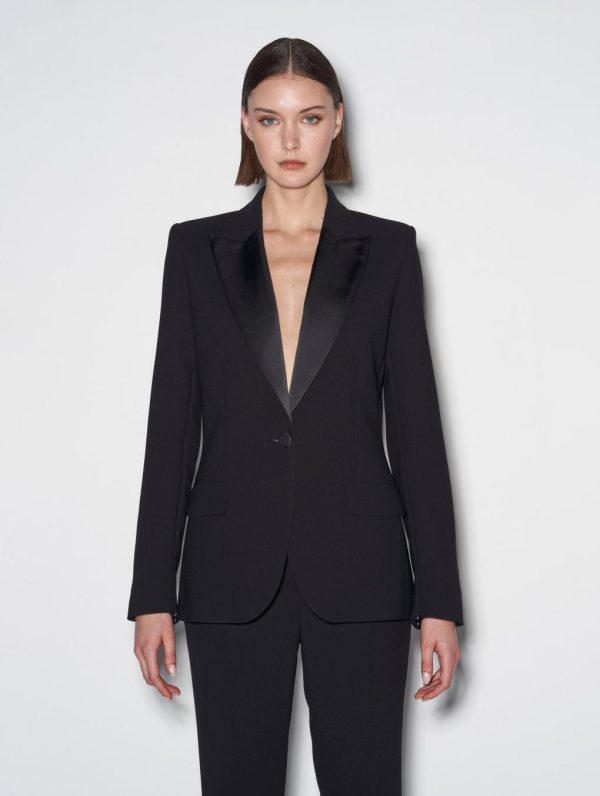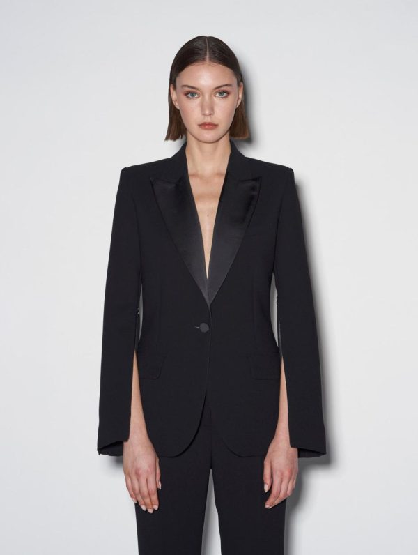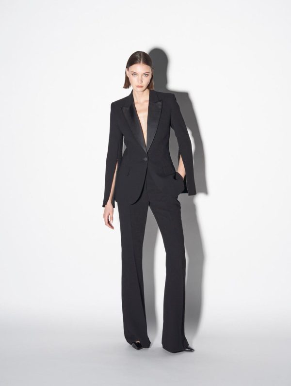 This timeless black crepe jacket with its wide shawl collar in black silk satin will bring an elegant touch to your evening or formal occasion wear. This women’s tuxedo jacket features a covered button and discreet zips on the sleeves enabling the jacket to be worn like a cape. The jacket is enhanced with faceted crystal jewel buttons on the cuffs and our signature silver metal piercing at the back. For maximum effect wear this women’s black suit jacket next to the skin teamed with the matching flared suit trousers.Model measures 177cm tall, with 88cm hips, 59cm waist and 75cm bust / Model measures 5’9,5″ tall, with 34″ 1/2 in. hips, 23″ in. waist and 29″ 1/2 in. bust.