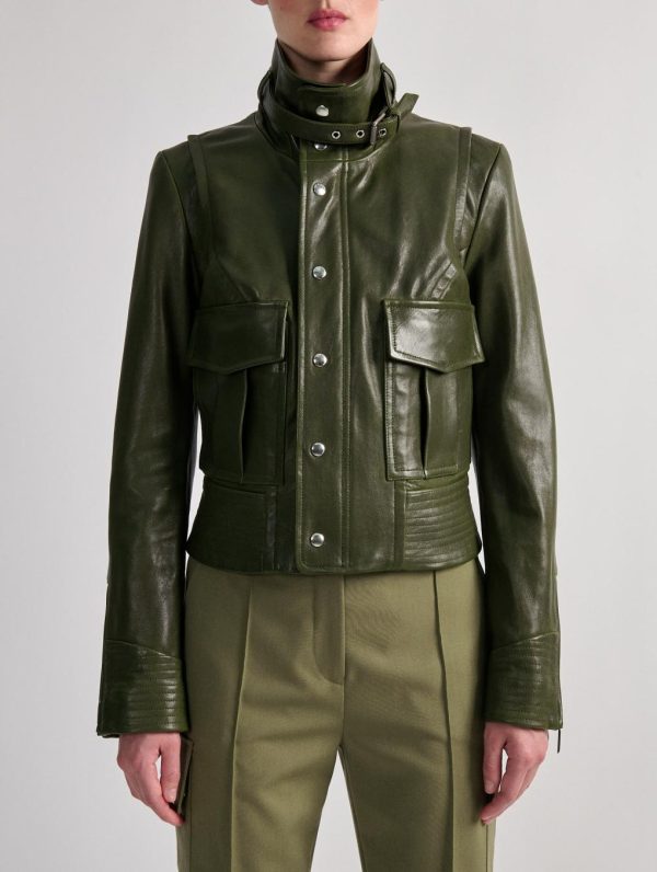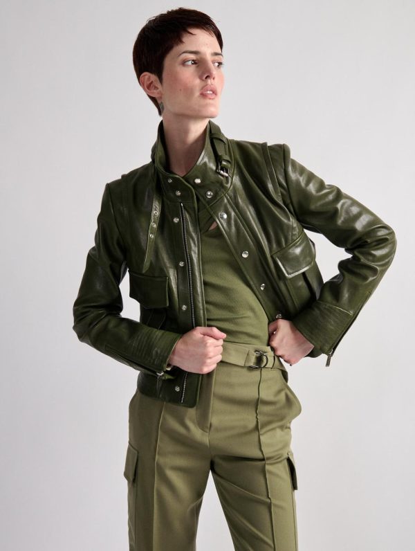 This premium lambskin jacket in khaki or camel offers a sophisticated alternative to traditional trench coats. The contemporary short cut features dynamic panel stitching and strategic detailing that creates a structured, fashion-forward silhouette. Thoughtful design elements like the extended sleeve zippers allow for stylish layering possibilities. Barbara Bui’s innovative take on the classic biker jacket makes this piece an essential transitional season statement.