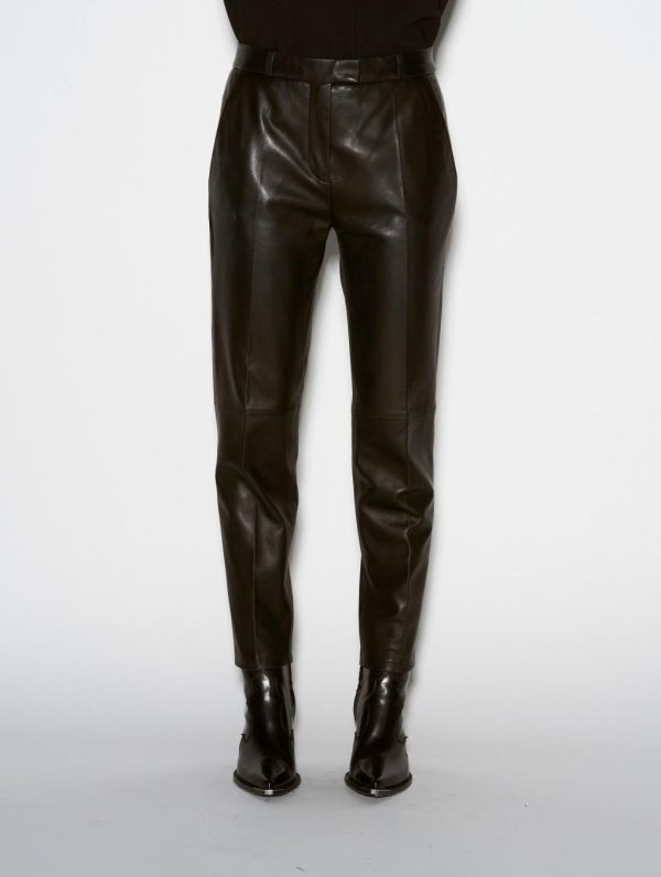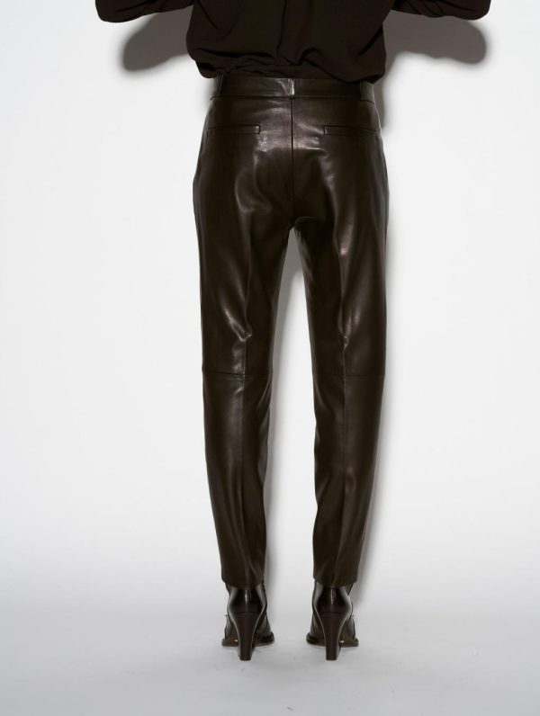 Showcasing Barbara Bui’s tailoring expertise, our Roxy trousers are revisited in leather, our designer’s favourite material, for the autumn/winter season. These women’s trousers in plongé calfskin leather offer a stylish fitted look suitable for day or evening wear. The 7/8 length enhances a pair of elegant ankle boots while the front pleat makes your legs look longer. With its rear welt pockets, slant pockets and concealed button placket, these black leather trousers compare well with the best-made tailored pieces from our collection.Model measures 176cm tall, with 88cm hips, 60cm waist and 79cm bust / Model measures 5’9,2″ tall, with 34″ 1/2 in. hips, 23,6″ in. waist and 31″ in. bust.