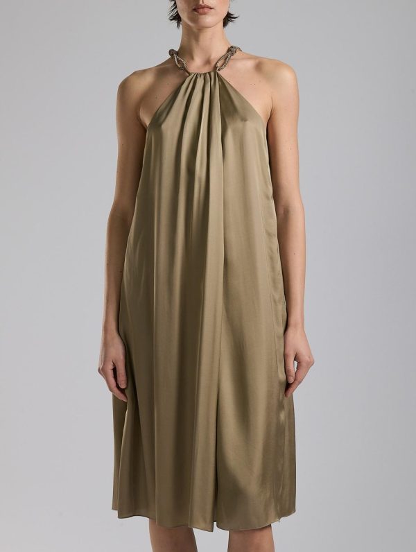 Elevate your evening wardrobe with this exquisite dress featuring a stunning rhinestone-adorned neckline. The warm gold-tone crystal accents beautifully contrast with the lightweight viscose satin fabric available in sophisticated black and versatile sand hues. Designed with a flattering trapeze silhouette, this versatile piece can be worn loose for effortless elegance or cinched with a belt to define your waistline. Perfect for special occasions when paired with heels or dressy sandals.