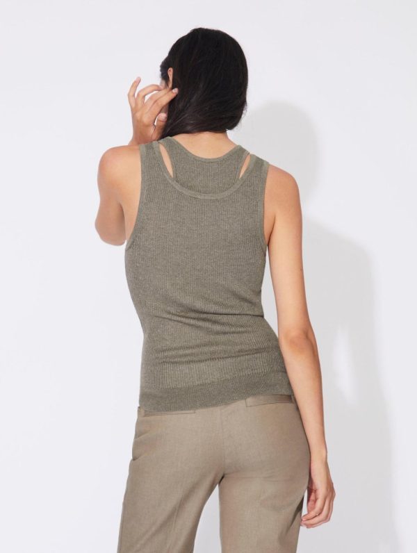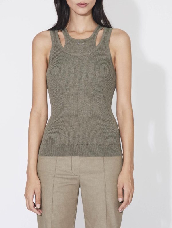 This 2 in 1 tank top sweater plays with the codes of the women’s smart casual wardrobe. Made in black or linden green pearly knit, this trompe-l’oeil top is composed of one single piece made to look like two tank tops, one on top of the other. The halterneck is enhanced with our signature detachable piercing in silver tone stainless metal to give a rock look. For a perfect drape this close-fit lightweight knit features subtle ladder stitch detail that accentuates the waist. Worn with suit trousers or a more casual outfit, this sleeveless sweater works with all your fashion looks.Model measures 177cm tall, with 90cm hips, 61cm waist and 81cm bust / Model measures 5’9½” tall, with 35½” in. hips, 24″ in. waist and 32″ in. bust.
