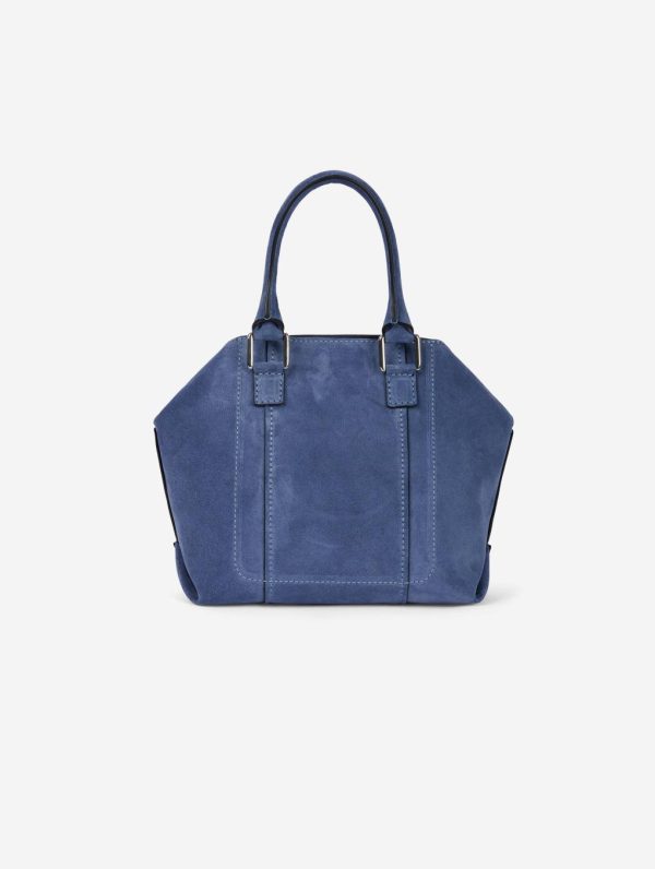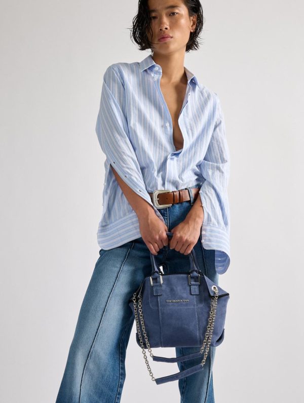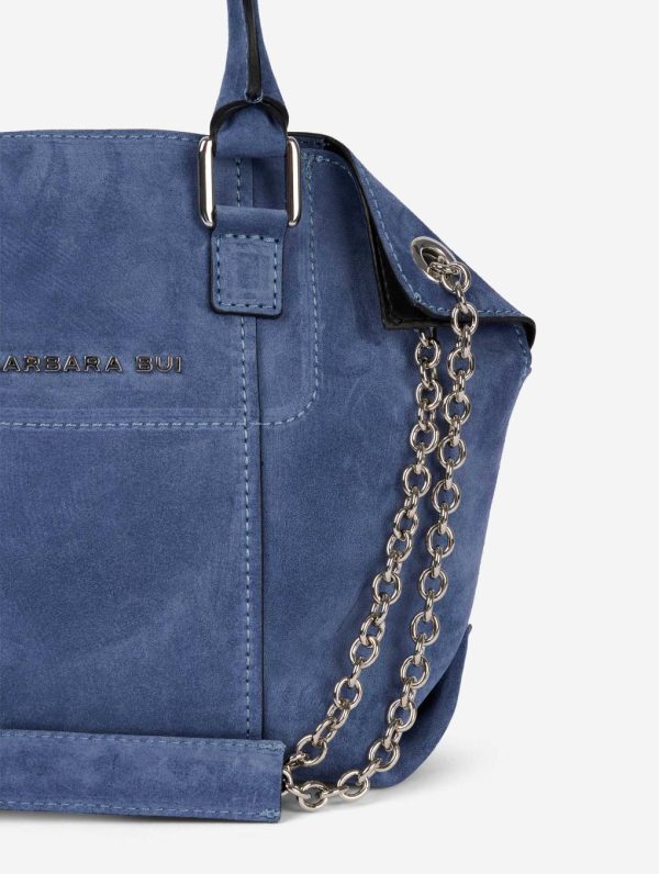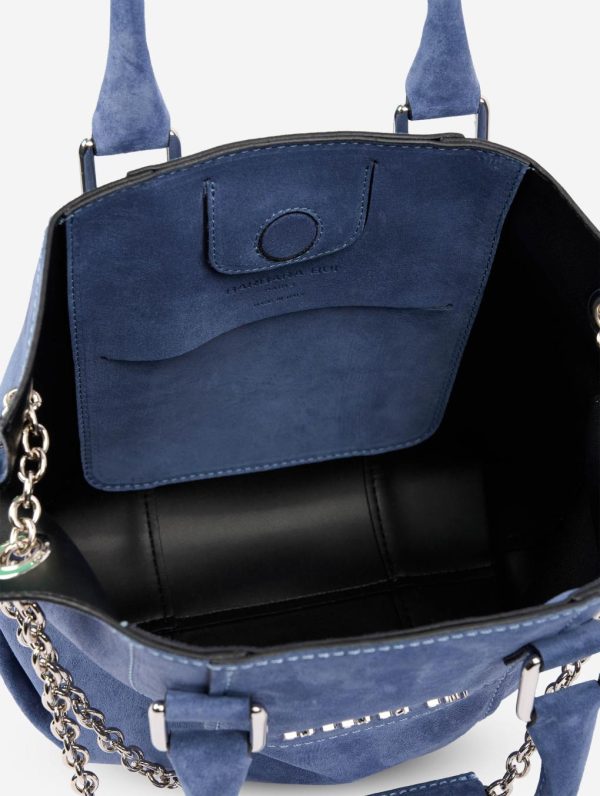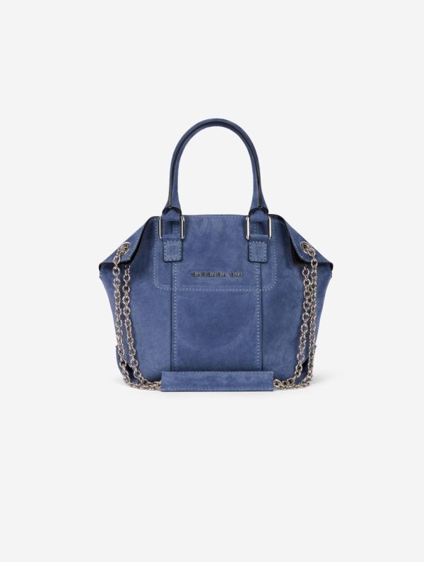 “LITTLE CHAMALLOW” small tote bag in jeans-blue suede calfskin, laminated on its reversible-effect lining. Articulated hand-carry handles and sliding chain shoulder strap for either short double-chain or long single-chain carrying. Inside patch pocket and central magnetic closure. Height: 23cm – Length: 33cm – Depth: 12cm.Heigth: 23cm – Length: 33cm – Depth: 12cm.