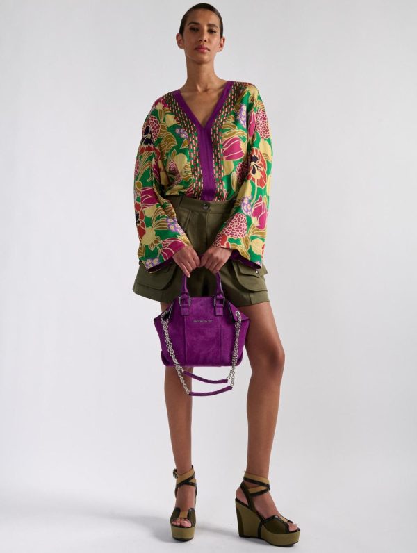 “LITTLE CHAMALLOW” small tote bag in bougainvillea suede calfskin bonded to its reversible-effect lining. Articulated hand-carry handles and sliding chain shoulder strap allowing either short double chain or long single chain shoulder carrying. Inside patch pocket and central magnetic closure.Height: 23cm – Length: 33cm – Depth: 12cm.Heigth: 23cm – Length: 33cm – Depth: 12cm.