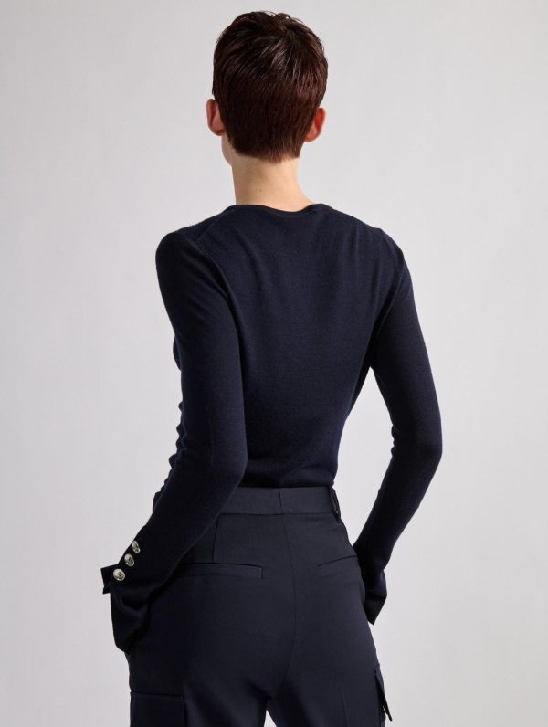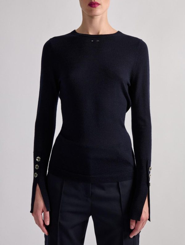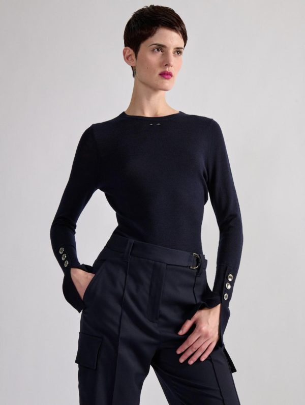 Available in a soft linden green or navy blue, this fine knit sweater in a wool and silk blend is a timeless piece that lends itself to endless styling possibilities. This classic round-neck design stands out with its elegant split cuffs, highlighted by a row of silver-tone metal buttons, echoing its piercing detail. Whether paired with cargo trousers or tailored trousers, this elegant women’s sweater is a perfect match for any outfit.