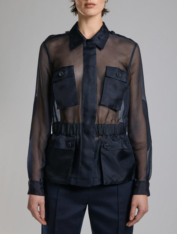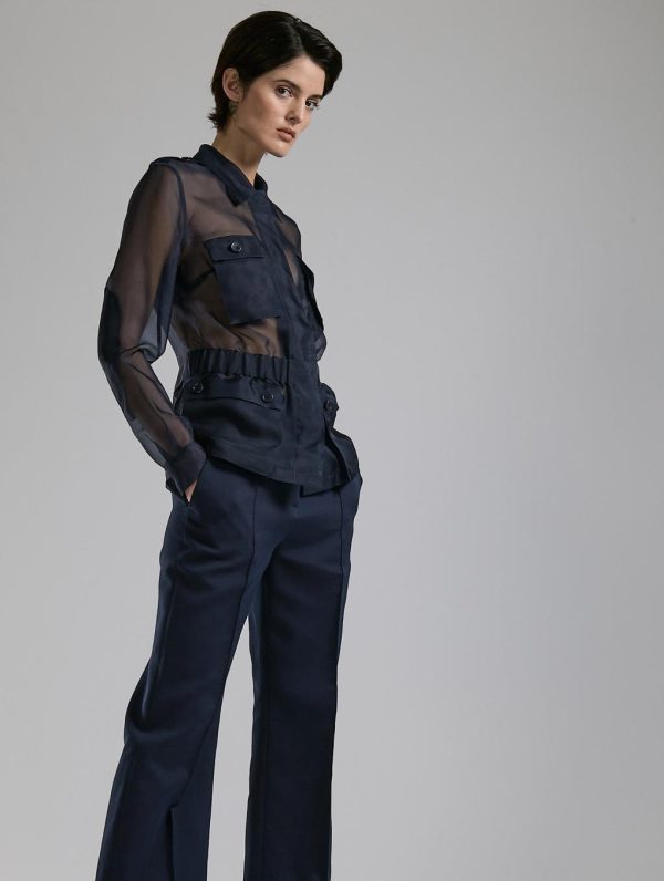 The ethereal transparency of organza inspired Barbara Bui to design this lightweight safari jacket that plays with transparency. Suggesting more than it reveals of the body, this jacket with an elasticated waist, extended by a belt at the back, exudes a sensual and modern allure. Its remarkable construction, patch pockets with tone-on-tone buttons, concealed button placket, and classic collar enhance the elegance of this unique piece that proudly embodies a couture spirit.
