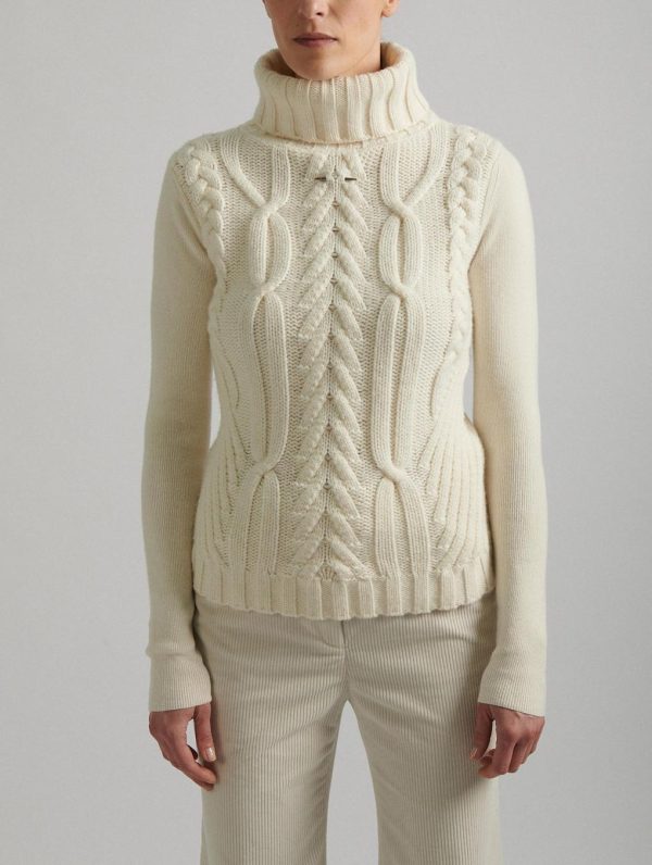 Inspired by chunky winter sweaters but crafted in a wool and cashmere version for controlled volume that facilitates layering, this cable-knit sweater is a fall-winter wardrobe favorite. The play of twists on the front suggests a chunky sweater, while the back and long sleeves in classic knit underline the refined purity of this turtleneck sweater. On the front, the iconic removable silver metal piercing designed by Barbara Bui.Model measures 178cm tall, with 89cm hips, 64cm waist and 86cm bust / Model measures 5’10” tall, with 35″ in. hips, 25″ in. waist and 34″ in. bust.