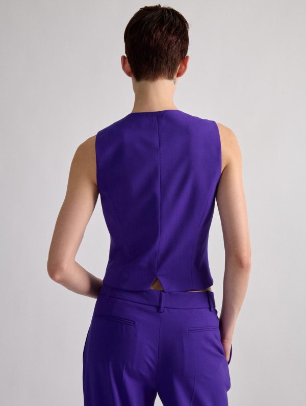 Barbara Bui’s signature tailoring is revealed in this plain suit vest, available in timeless black or bold purple. Crafted in a lightweight stretch wool fabric, this suit vest is a must-have, offering a slim fit that structures the silhouette with style. Its sleek piped pockets and finely worked collar underline the House’s sartorial heritage. Wear this sleeveless cardigan as a total look with the matching wide-leg pants for a structured, formal look.